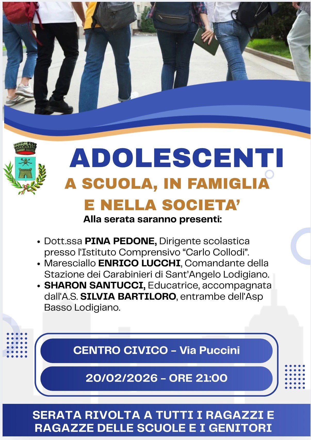 L’Amministrazione Comunale di Valera Fratta invita tutta la cittadinanza a partecipare alle ore 21:00 di venerdì 20/02/2026, all’incontro pubblico dedicato al tema dell’adolescenza e famiglia, della scuola e la società, aperto a tutti i ragazzi e ragazze e ai genitori.